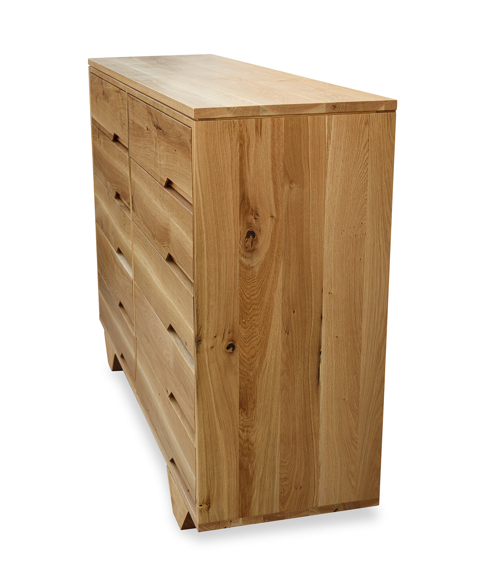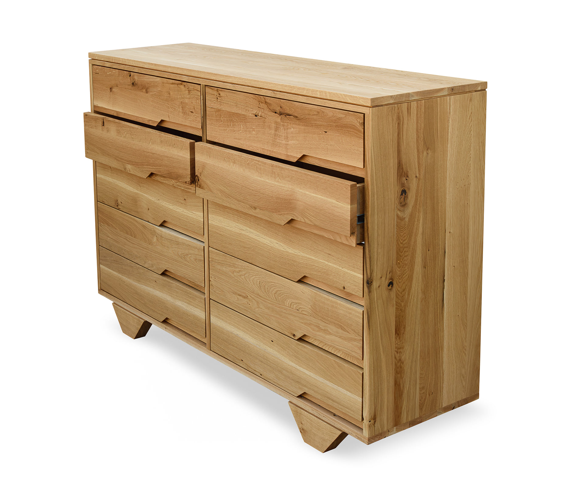Comoda realizată din lemn de stejar masiv, prevăzută cu zece sertare, este finisată cu poliuretan pe bază ulei și se remarcă printr-o construcție solidă, potrivită atât pentru living, cât și pentru dormitor. Produsă de Atelierul de Tâmplărie din Târgu Mureș, piesa are un design simplu, dar elegant, evidențiat de plăcile de stejar de cea mai bună calitate. Partea frontală este realizată dintr-o singură placă, ceea ce face ca sertarele să depășească rolul strict funcțional. Farmecul lor aparte este dat de îmbinările precise și de continuitatea naturală a fibrei lemnului.