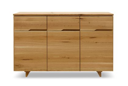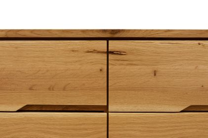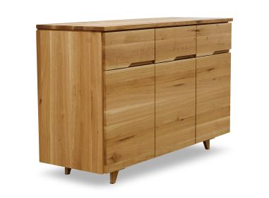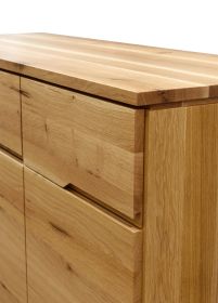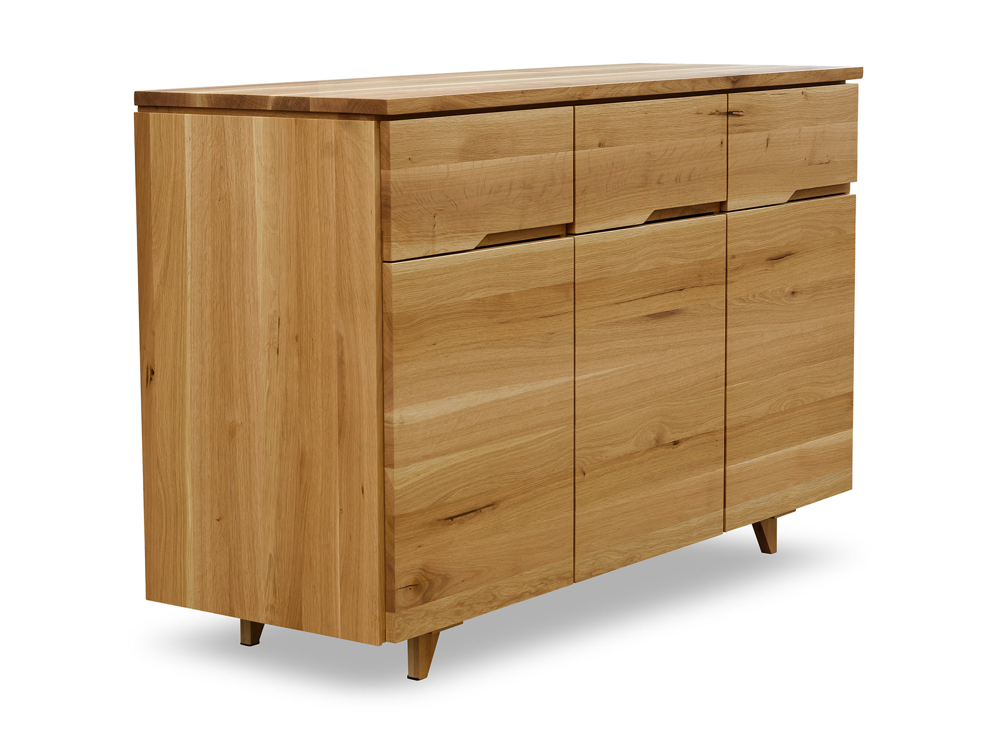 Comoda din lemn de stejar masiv prevăzută cu trei uși și trei sertare, are o constructie solida care se va potrivi in orice living sau dormitor. Comoda produsa de Atelierul de Tâmplărie din Târgu Mureș are o formă simplă dar totodata deosebita care este data de placile de de stejar de cea mai bună calitate. Fata comodei este realizata dintr-o singura placa, astfel că sertarele și usile nu au doar un rol funcțional. Aspectul lor deosebit este dat de imbinarile perfecte si continuitatea nervurilor lemnului.