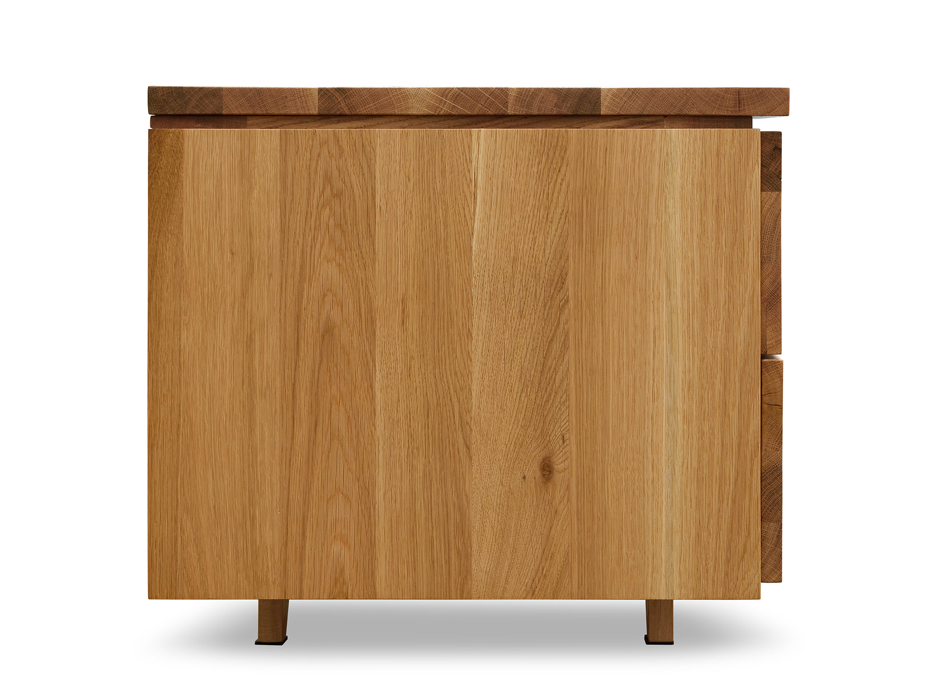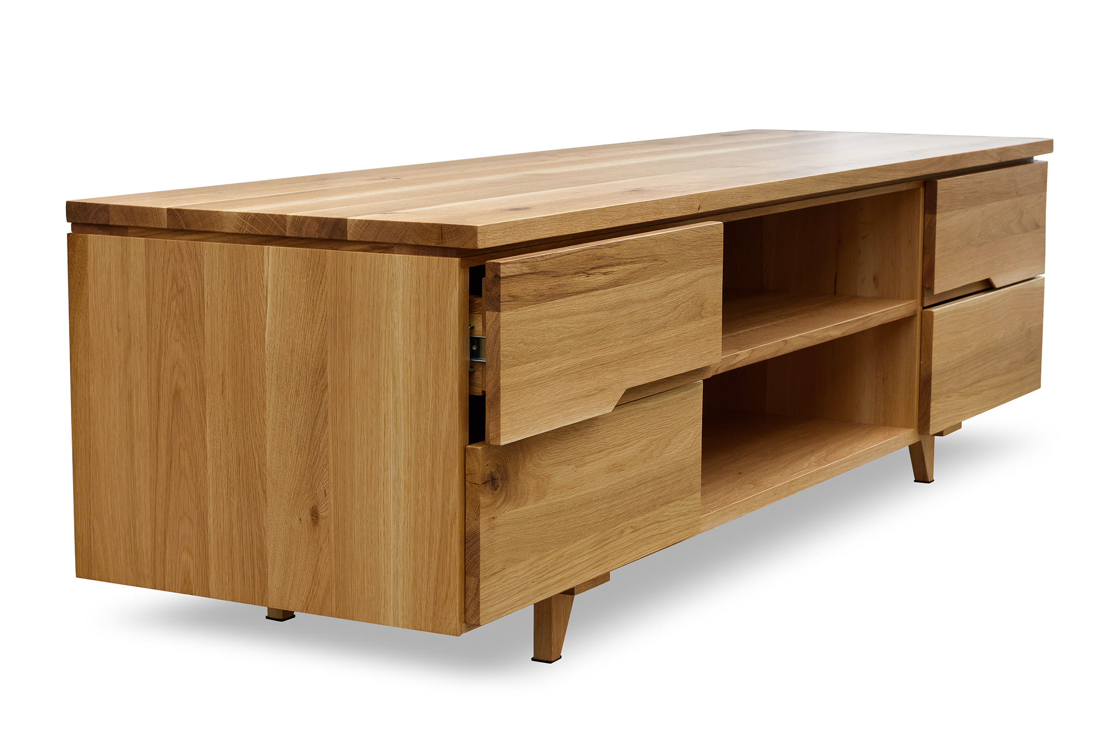 Comoda TV din lemn masiv de stejar este prevazuta cu 4 sertare. Avand o constructie solida se potriveste in orice living sau dormitor. Comoda produsa de Atelierul de Tâmplărie din Târgu Mureș are o formă simplă dar totodata deosebita care este data de placile de de stejar de cea mai bună calitate. Fata comodei este realizata dintr-o singura placa, astfel ca usile nu au doar un rol funcțional. Aspectul lor deosebit este dat de imbinarile perfecte si continuitatea nervurilor lemnului.