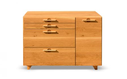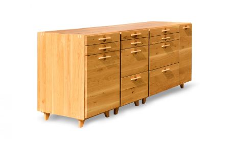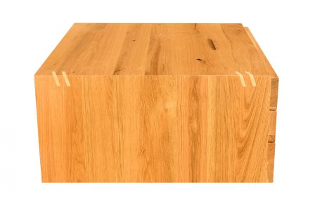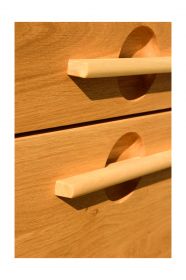 Pentru realizarea acestor corpuri de bucatarie s-a ales stejarul pentru forta si culoarea sa calda. Forma elaborata a sertarelor aduce un plus de eleganta corpurilor. Manerele au fost realizarte din tei pentru a crea un contrast ce scoate in evidenta nuanta naturala a stejarului .