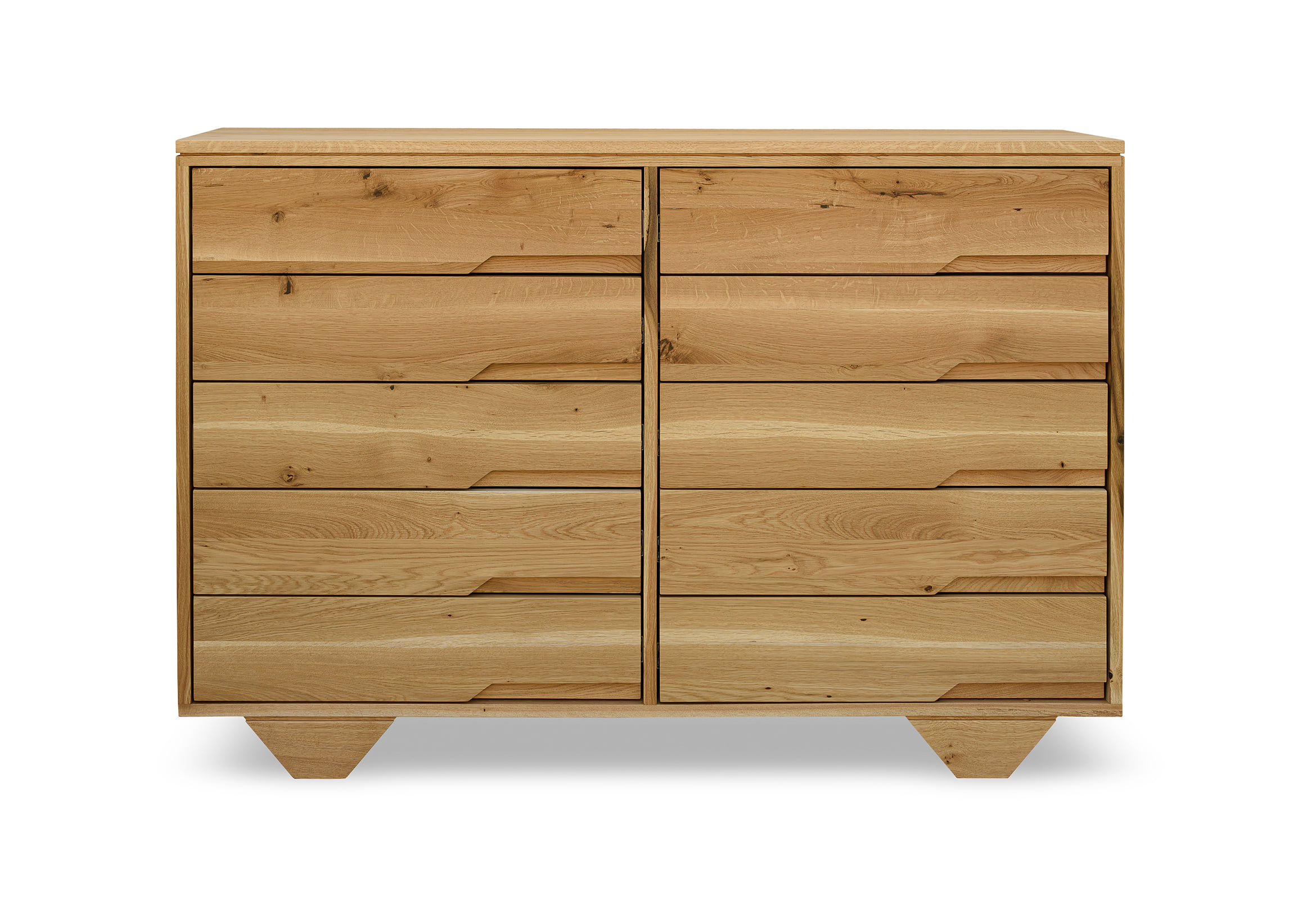 Comoda realizată din lemn de stejar masiv, prevăzută cu zece sertare, este finisată cu poliuretan pe bază ulei și se remarcă printr-o construcție solidă, potrivită atât pentru living, cât și pentru dormitor. Produsă de Atelierul de Tâmplărie din Târgu Mureș, piesa are un design simplu, dar elegant, evidențiat de plăcile de stejar de cea mai bună calitate. Partea frontală este realizată dintr-o singură placă, ceea ce face ca sertarele să depășească rolul strict funcțional. Farmecul lor aparte este dat de îmbinările precise și de continuitatea naturală a fibrei lemnului.